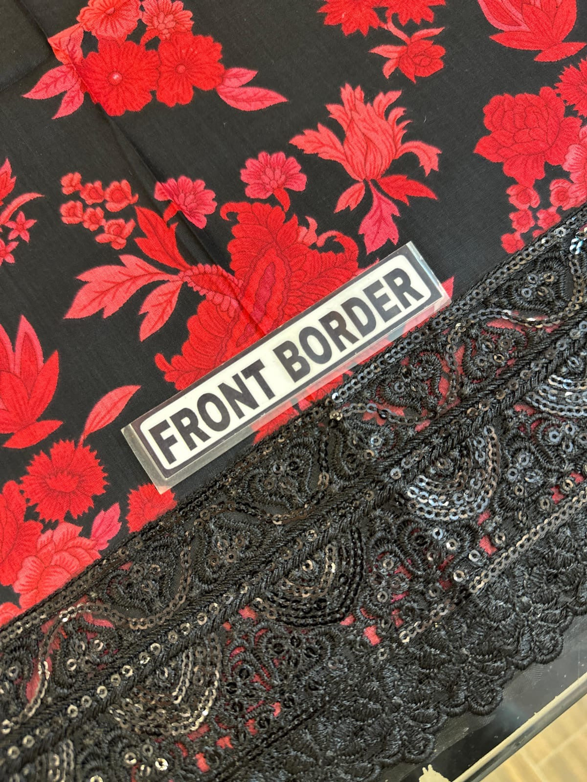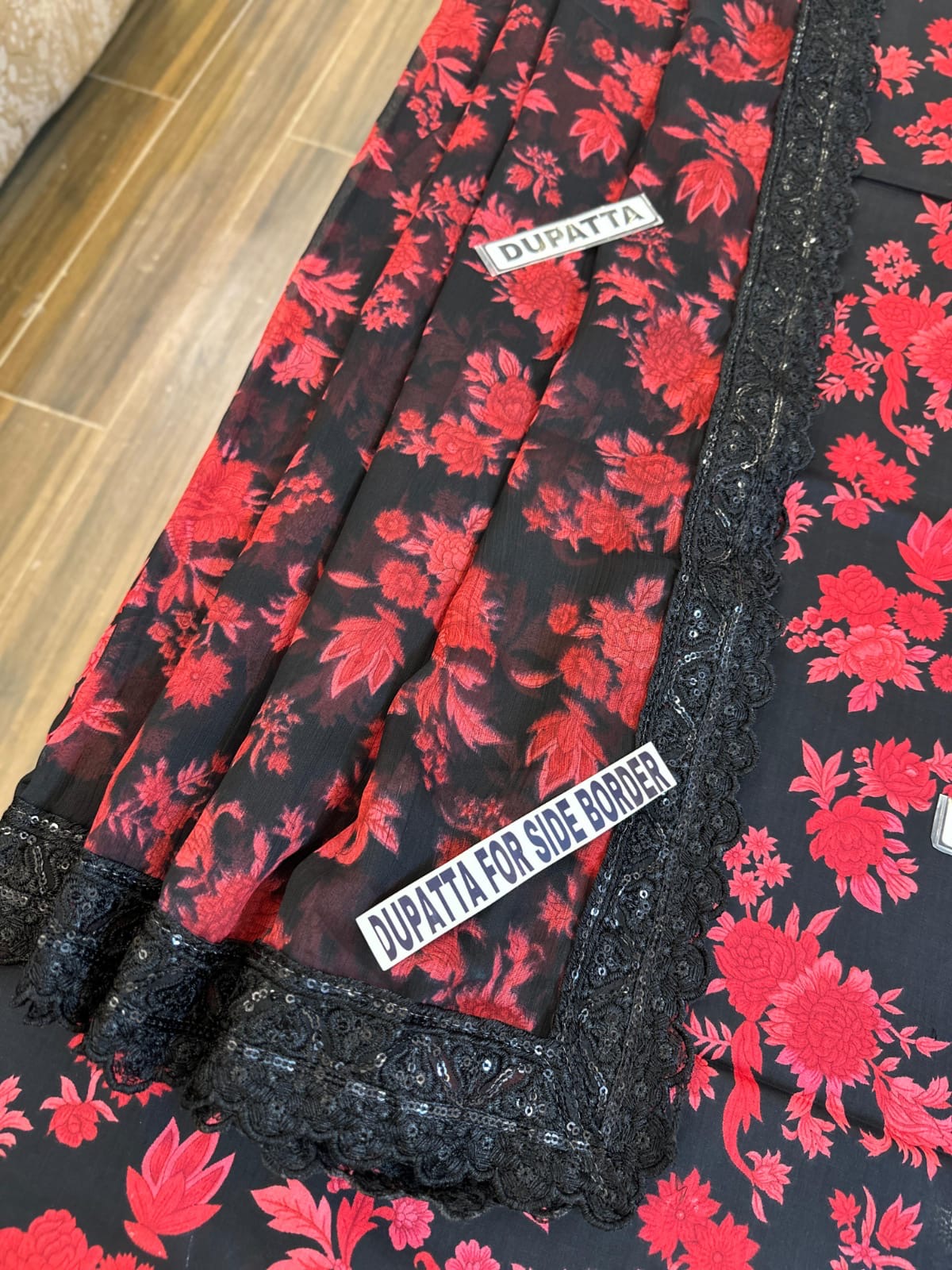 • Printed chiffon dupatta with 4-side embroidered border attached (ready to wear)